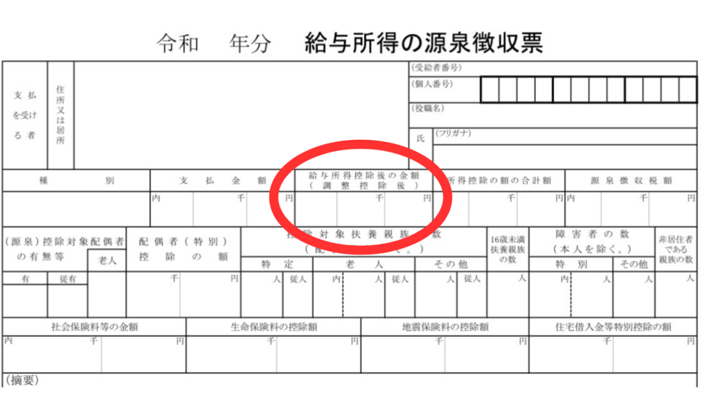 【見分け方ガイド】 源泉徴収票の上の段、左から2番目にあるのが「給与所得控除後の金額」です。